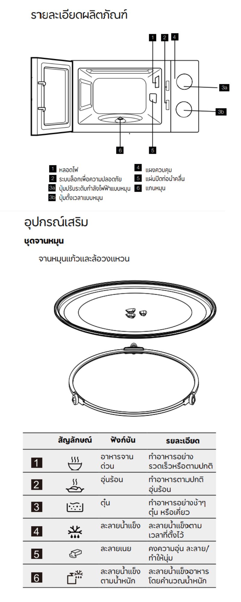 - ระบบจานหมุนรอบทิศทาง เพื่อกระจายความร้อนให้อาหารสุกอย่างทั่วถึง