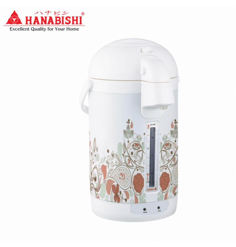 Hanabishi กระติกน้ำร้อนไฟฟ้า รุ่น 8002 ลาย Modern flower หม้อด้านในผลิตจาก สแตนเลส สตีลอย่างดี มาพร้อมแถบระดับน้ำเพื่อให้คุณสามารถมองเห็นระดับน้ำได้ชัดเจนยิ่งขึ้น มีระบบ Keep Warm ช่วยให้น้ำร้อนอยู่เสมอ และมีระบบต่างๆช่วยให้คุณใช้งานได้ง่ายได้แก่ ระบบกดน้ำแบบปั๊ม Air Pump Dispense , ระบบล็อคฝากระติกน้ำ และระบบล็อคที่กดน้ำ