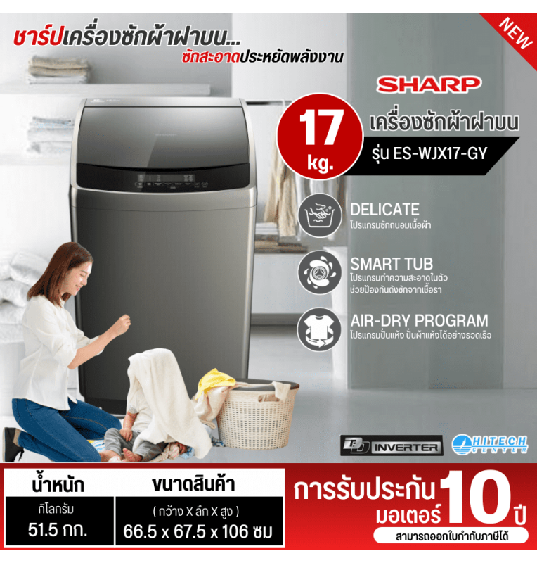 SHARP เครื่องซักผ้า อินเวอร์เตอร์ มอเตอร์ไดเร็คไดร์ฟ ชาร์ป 17 กิโลกรัม รุ่น ES-WJX17-GY ราคาถูก รับประกัน 10 ปี จัดส่งทั่วไทย เก็บเงินปลายทาง ไฮเทคเซ็นเตอร์