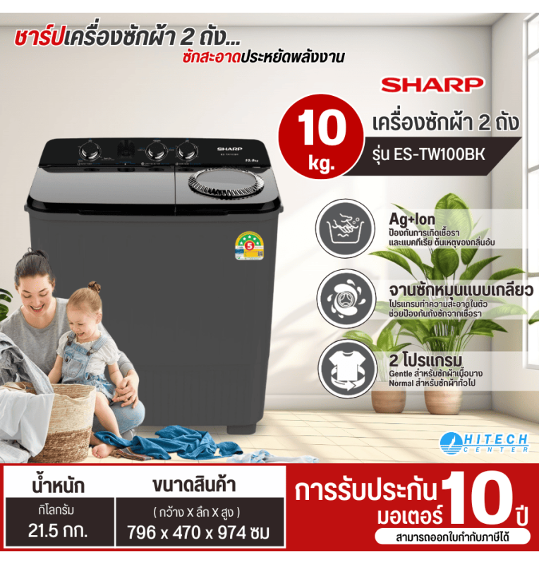 SHARP เครื่องซักผ้า2ถัง เครื่องซักผ้าถังคู่ เครื่องซักผ้าชาร์ป เครื่องซักผ้า 10 กิโลกรัม รุ่นใหม่ ES-TW100BK ราคาถูก รับประกันศูนย์ 10 ปี จัดส่งทั่วไทย เก็บเงินปลายทาง