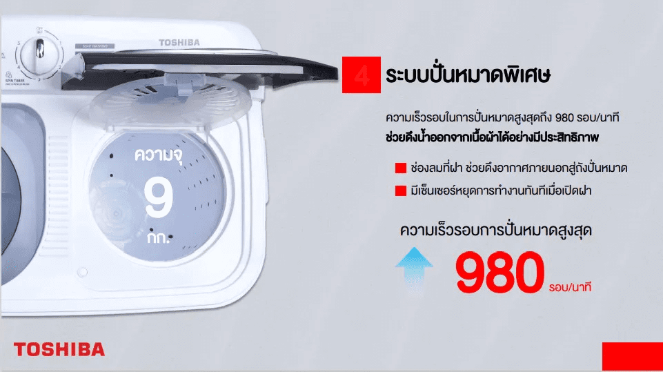 - กำลังไฟฟ้าสูงสุด 740 วัตต์ ซัก 520 / ปั่น 220 วัตต์