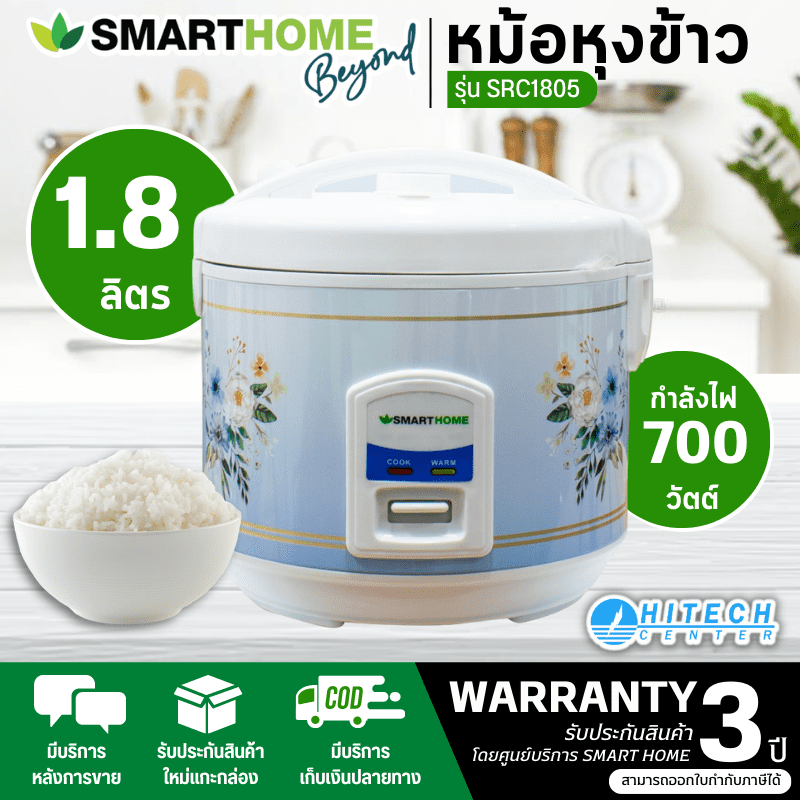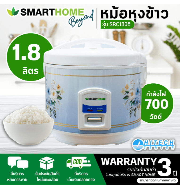 SMARTHOME หม้อหุงข้าวอัตโนมัติ หม้อหุงข้าวอุ่นทิพย์ สมาร์ทโฮม ความจุ 1.8 ลิตร รุ่น SRC1805 รับประกัน 3 ปี จัดส่งทั่วไทย เก็บเงินปลายทาง ไฮเทคเซ็นเตอร์