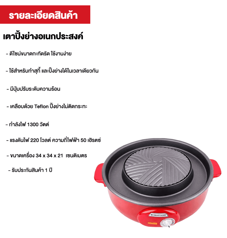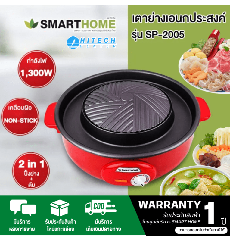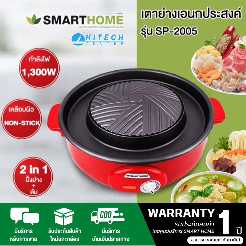 SMARTHOME เตาปิ้งย่างอเนกประสงค์ เตาหมูกระทะไฟฟ้า กระทะปิ้งย่าง-ชาบู สมาร์ทโฮม รุ่น SP-2005 รับประกัน 3 ปี จัดส่งทั่วไทย เก็บเงินปลายทาง ไฮเทคเซ็นเตอร์