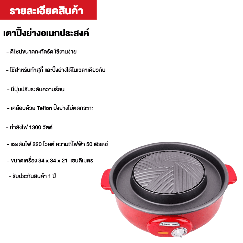 SMARTHOME เตาปิ้งย่างอเนกประสงค์ 1300 วัตต์ รุ่น SP-2005 เคลือบด้วย Teflon ปิ้งย่างไม่ติดกระทะ ใช้งานง่าย | HITECH CENTER