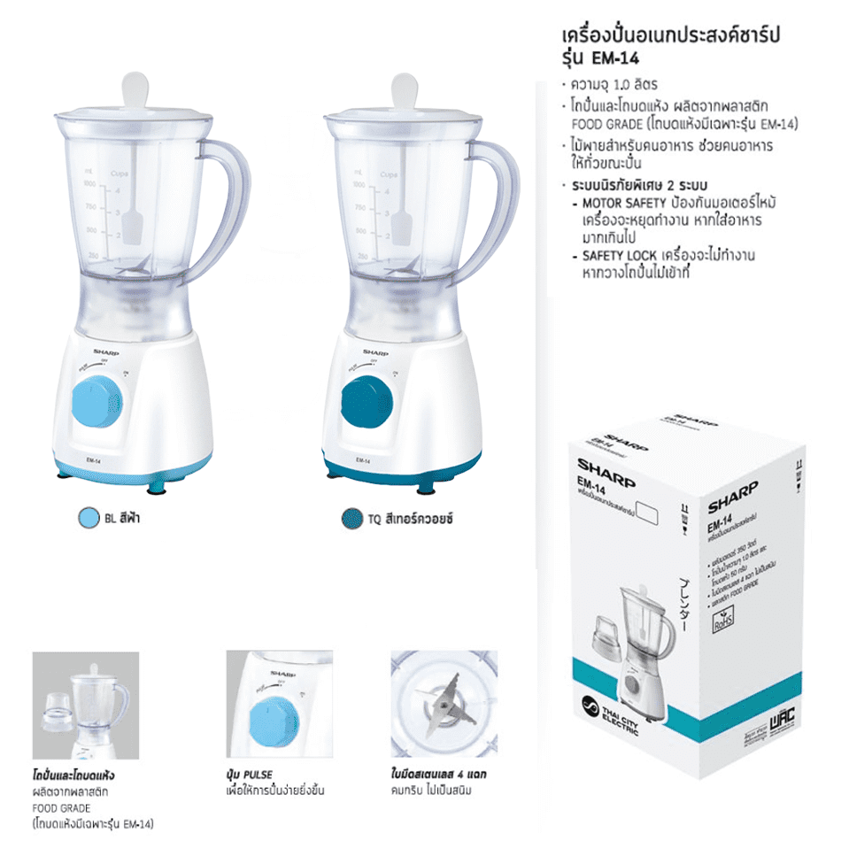 ป้ายกำกับ: SHARP เครื่องปั่นเอนกประสงค์ 1 ลิตร รุ่น EM-14 ใบมีดสเตนเลส 4 แฉกทนทานไม่เป็นสนิม มีรับประกัน 1 ปี